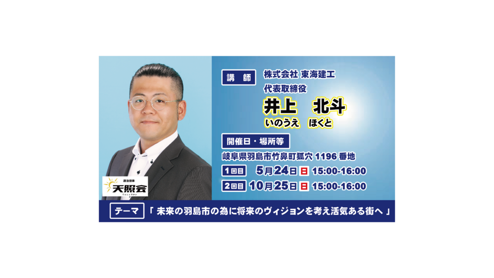 株式会社東海建工代表取締役の井上北斗(いのうえほくと)氏による講演会です。参加費は無料ですのでたくさんの方のご来場をお待ちしております。