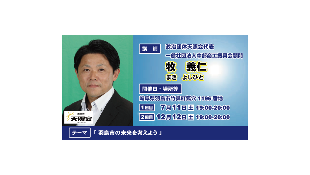 天照会代表、一般社団法人中部商工振興会顧問の牧義仁(まきよしひと)氏による講演会です。参加費は無料ですのでたくさんの方のご来場をお待ちしております。